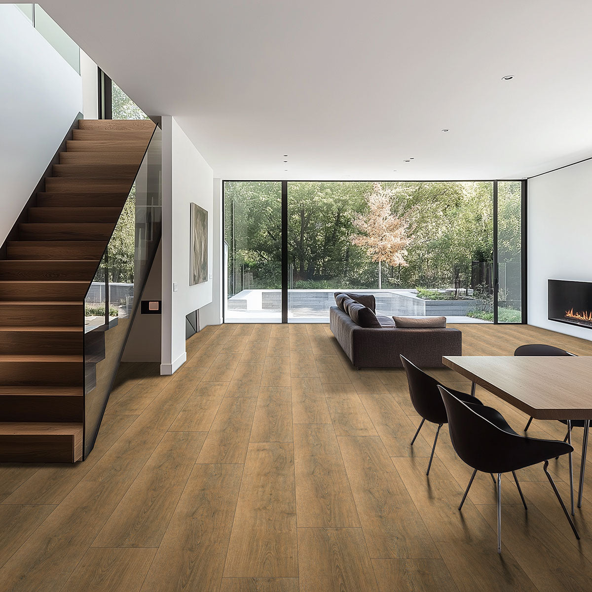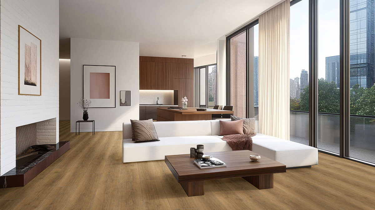 Macland luxury vinyl planks from the Wayne Parc Reserve™ Collection bring a bold, rustic-inspired look with deep chestnut brown tones, pronounced knotting, and natural variation, enhanced by grain-aligned EIR embossing and a low-sheen UltraMatte™ finish for authentic wood character. Designed in wide 9” x 72” planks, Macland features a substantial 12mm build with a waterproof WPC core that provides durability along with a warm, cushioned feel underfoot. A high-performance 30MIL CrystaLux Ultra™ wear layer protects against scratches, moisture, and everyday impact, while pressed natural bevels add depth and definition. Finished with a 100% natural cork backing for improved sound absorption and added comfort that helps mask minor subfloor imperfections, Macland installs easily with a drop-lock system and requires no acclimation, delivering a reliable hardwood alternative suited for modern lifestyles.