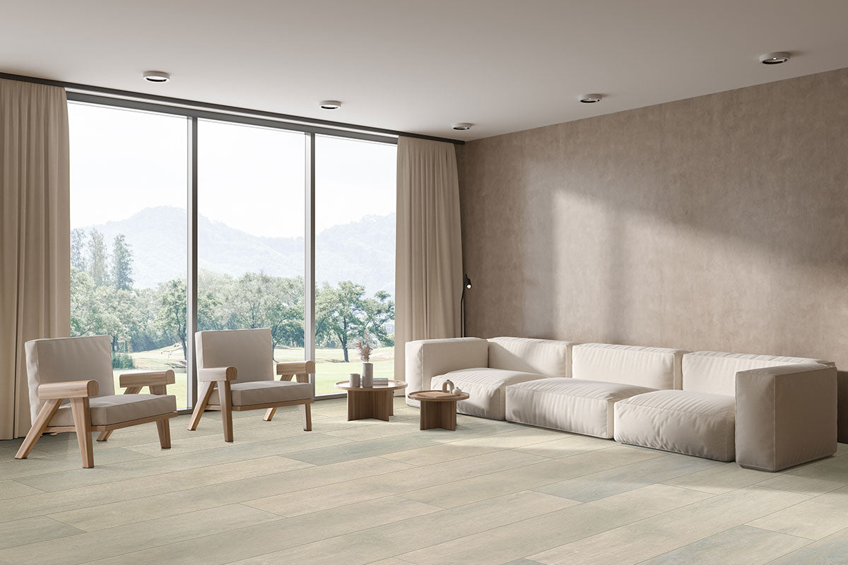 Waldron luxury vinyl planks from the Wayne Parc Reserve™ Collection present a warm, dark sandy-blonde palette with soft tonal movement and understated knot detail, refined through grain-aligned EIR embossing and a smooth UltraMatte™ finish for a true-to-wood appearance. Crafted in wide 9” x 72” planks, Waldron features a substantial 12mm construction with a waterproof WPC core that delivers stability along with a comfortable, cushioned feel underfoot. A high-performance 30MIL CrystaLux Ultra™ wear layer protects against scratches, spills, and daily wear, while pressed natural bevels enhance plank definition. Finished with a 100% natural cork backing to improve sound absorption and help conceal minor subfloor imperfections, Waldron installs easily using a drop-lock system with no acclimation required, offering a durable, modern wood look designed for everyday living.
